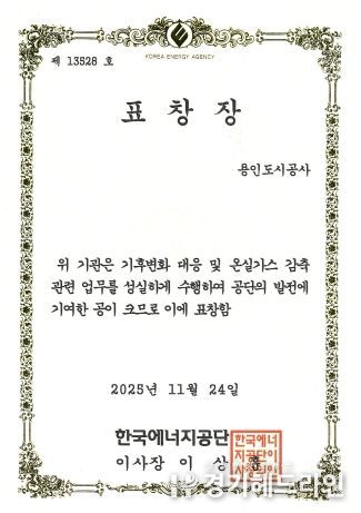 신경철 용인도시공사 사장은“이번 표창은 전 임직원이 함께 노력한 결과이며, 앞으로도 지역사회와 함께 기후위기 대응에 앞장서겠다”라며“지속가능한 도시를 만들기 위해 친환경 경영을 더욱 강화해 나갈 것”이라고 전했다.