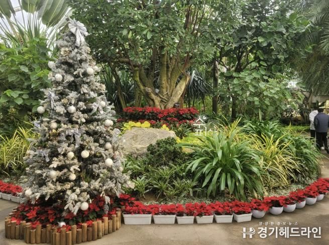 전시 공간에는 포인세티아, 시클라멘 등 겨울을 상징하는 식물들이 배치됐으며, 입구에는 트리 장식이 설치돼 관람 동선을 따라 식물을 감상할 수 있도록 구성했다. 이에 더해 실내에는 스카이워크 난간을 활용한 꽃걸이 화분 등 다양한 형태의 식물 전시가 마련됐다.