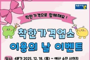 시 관계자는 “이번 이벤트는 착한가격업소 이용을 알리고 시민 편의를 높이기 위한 것”이라며 “이용을 희망하는 시민들은 운영 기간과 유의사항을 미리 확인해 주시기 바란다”고 말했다.