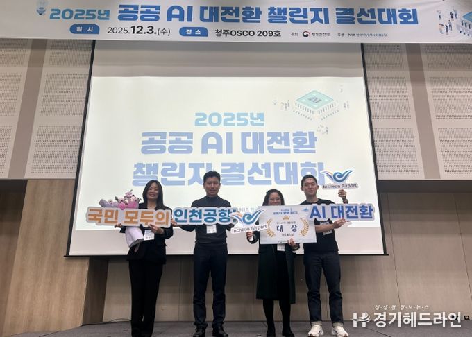 [경기헤드라인=문수철 기자] 인천국제공항공사는 지난 3일 청주 오스코에서 열린 ‘2025년 공공 AI대전환 챌린지 우수사례 왕중왕전’에서 대상(국무총리상)을 수상했다고 4일 밝혔다.