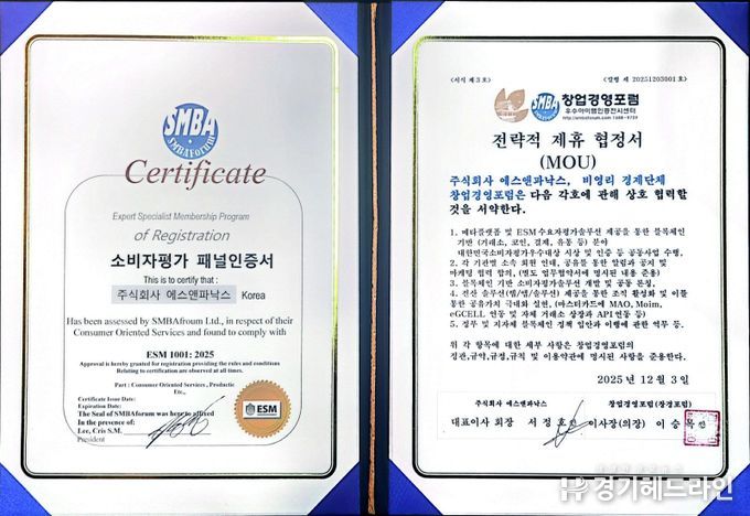 또한 12월3일 .(주)에스앤파낙스(서정호 대표)는 대한민국 소비자평가 단체 창업경영포럼과 전략적제휴 및 우수기업으로 인증 받으며 글로벌 시장으로 발돋움하는 계기를 마련했다.