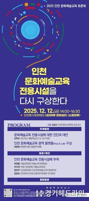 [경기헤드라인=문수철 기자] (재)인천문화재단은 오는 12월 12일 14시, 인천중구문화재단 내리마루 문화쉼터에서 '2025 인천 문화예술교육 토론회' “인천 문화예술교육 전용시설을 다시 구상한다”를 개최한다.
