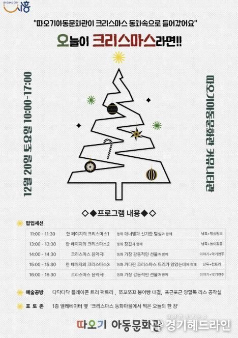 [경기헤드라인=문수철 기자] 시흥시 따오기아동문화관이 오는 12월 20일 크리스마스 문화행사 ‘오늘이 크리스마스라면’을 연다. 반짝이는 트리, 서늘한 겨울 공기, 책장을 넘기는 소리가 한데 어우러지며 문화관은 잠시 ‘이야기가 살아 움직이는 공간’으로 변한다.
