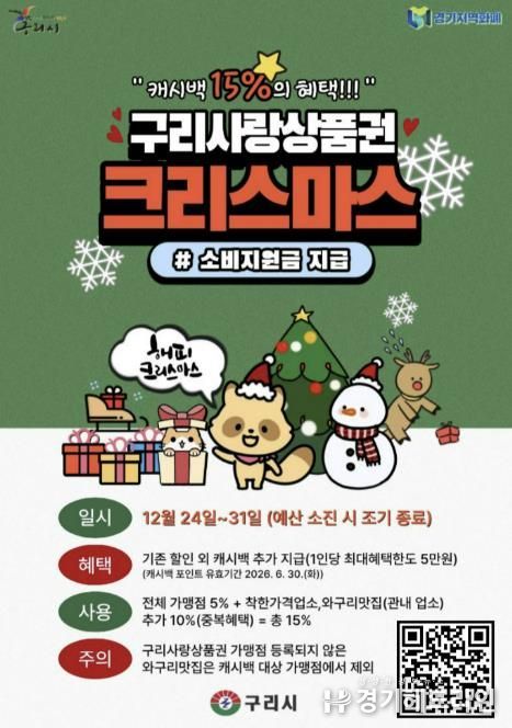 [경기헤드라인=문수철 기자] 구리시는 12월 24일부터 ‘구리사랑상품권 크리스마스 소비 지원금’을 지급한다고 밝혔다. 이번 소비 지원금은 연말연시 기간 지역 외로 유출되는 소비를 지역 내로 유도하고, 관내 상권 활성화와 소상공인 보호를 위해 마련됐으며, 예산 소진 시 조기 종료될 수 있다.