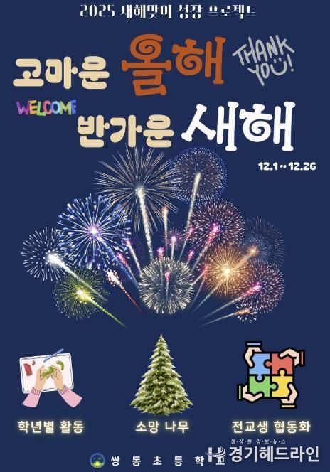 [경기헤드라인=정현수 기자] 쌍동초등학교는 연말연시를 맞아 전교생이 참여하는 ‘고마운 올해, 반가운 새해’ 새해맞이 성장 프로젝트를 진행했다. 학생들은 한 해를 돌아보고 감사의 마음을 표현하며, 새해 목표를 시각적으로 드러내는 다양한 활동을 경험했다.