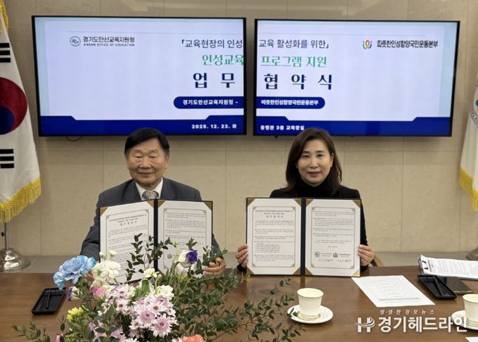 [경기헤드라인=문수철 기자] 경기도안산교육지원청은 12월 23일 오후 3시 30분, 따뜻한인성함양국민운동본부와 학교 현장의 인성교육 강화와 도덕성 회복을 위한 지역 연계형 인성교육 지원 체계 구축을 위한 업무협약(MOU)을 체결했다.