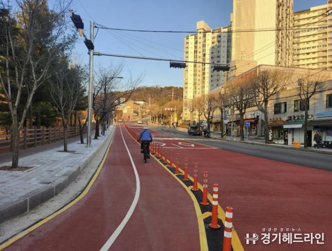또 광교산로 보행·자전거 이용 여건을 개선하기 위해 320m 길이의 자전거도로를 새로 조성했다. 보행자와 차량이 한 공간을 쓰던 구간에 자전거 전용 공간을 분리해 보행자와 자전거 이용자의 안전을 강화했다.