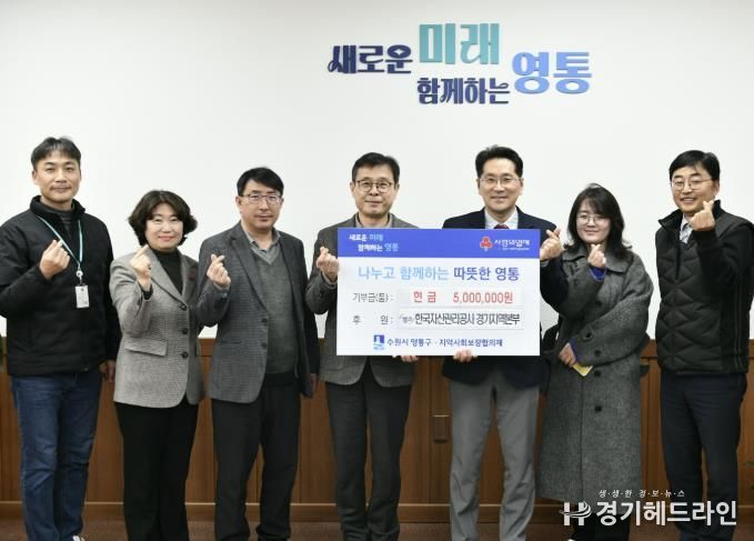 [경기헤드라인=문수철 기자] 수원시 영통구는 지난 24일 한국자산관리공사 경기지역본부에서 관내 경제적으로 어려움을 겪는 이웃을 위해 성금 500만 원을 기부했다고 밝혔다.