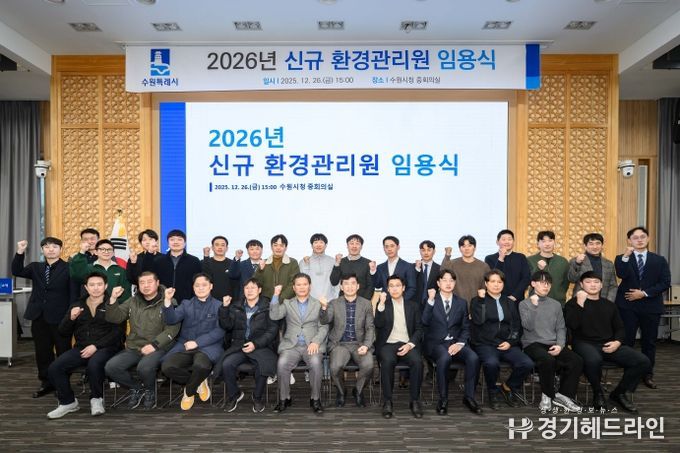 [경기헤드라인=문수철 기자] 수원특례시가 26일 시청 중회의실에서 2026년 신규 환경관리원 임용식을 열고, 신규 임용자 21명에게 임용장을 수여했다.