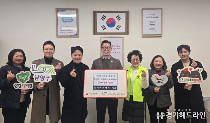 [경기헤드라인=문수철 기자] 남양주시는 30일 다산행정복지센터에서 ㈜에이트랙스 에프앤비가 지역 아동을 위한 과채주스 432박스를 전달했다고 밝혔다.