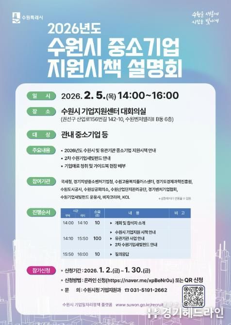 [경기헤드라인=문수철 기자] 수원특례시가 ‘2026 중소기업 지원시책 설명회’에 참가할 수원시 중소기업 대표·임직원 100여 명을 1월 30일까지 모집한다.