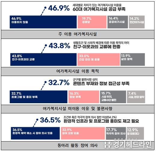 특히 60대 신노년층의 경우 노인여가복지시설 이용률이 상대적으로 낮아, 기존의 정책이 충분히 작동하지 않는 것으로 분석됐다.
