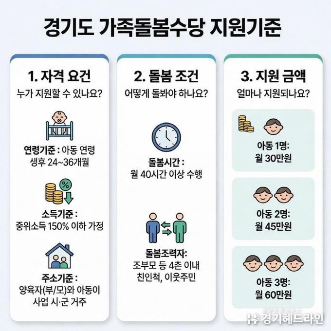 신청은 매월 1일부터 15일까지 경기민원24를 통해 온라인으로 가능하며, 돌봄활동 후 그다음 달에 수당이 지급된다.