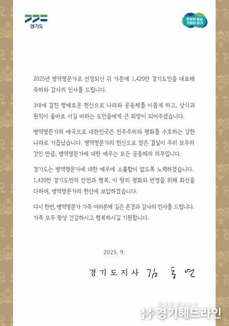 김동연 경기도지사는 서한문을 통해 “병역명문가의 애국으로 대한민국은 민주주의와 평화를 수호하는 강한 나라로 거듭났다”면서 “경기도는 병역명문가에 대한 예우에 소홀함이 없도록 노력하겠으며, 헌신에 보답하겠다”고 감사와 존경의 뜻을 표현했다.