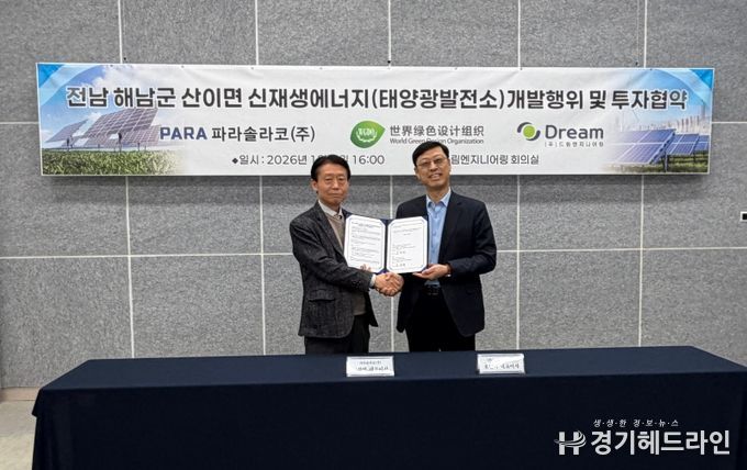 파라솔라코(주)(대표 고창열)와 (주)드림엔지니어링(대표 오진택)은 2026년 1월 6일 오후 4시, 드림엔지니어링 본사 회의실에서 ‘해남군 산이면 태양광발전소 개발허가 및 솔라시도 타운 조성 협약식’을 개최했다고 밝혔다.