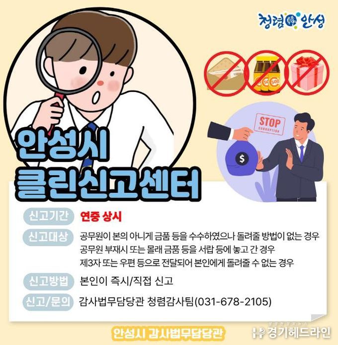 [경기헤드라인=문수철 기자] 안성시는 시민들에게 신뢰받는 공정하고 투명한 행정 서비스를 제공하기 위해 ‘클린신고센터’를 연중 상시운영하며 청렴한 행정문화 정착에 힘쓰고 있다고 밝혔다.