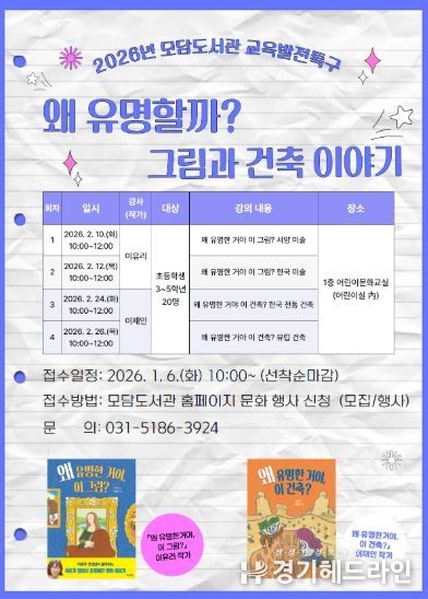 도서관 관계자는 “이번 프로그램을 통해 어린이들이 그림과 건축을 단순히 보는 것을 넘어, 왜 유명해졌는지 스스로 생각하고 예술을 통해 세상을 바라보는 시야를 넓히는 계기가 되길 기대한다”고 말했다.