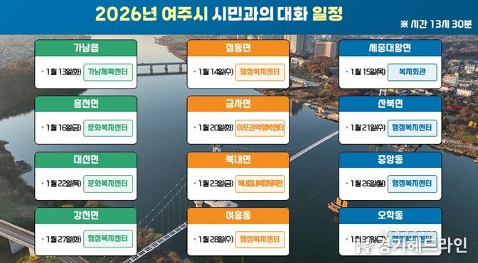 ‘2026년 시민과의 대화’는 △2026.1.13.(가남읍, 가남체육센터) △2026.1.14.(점동면, 행정복지센터) △2026.1.15.(세종대왕면, 복지회관) △2026.1.16.(흥천면, 문화복지센터) △2026.1.20.(금사면, 이포권역행복센터) △2026.1.21.(산북면, 행정복지센터) △2026.1.22.(대신면, 문화복지센터) △2026.1.23.(북내면, 북내실내복합체육관) △2026.1.26.(중앙동, 행정복지센터) △2026.1.27.(강천면, 행정복지센터) △2026.1.28.(여흥동, 여흥체육공원 실내체육관) △2026.1.30.(오학동, 행정복지센터) 순으로 진행된다.