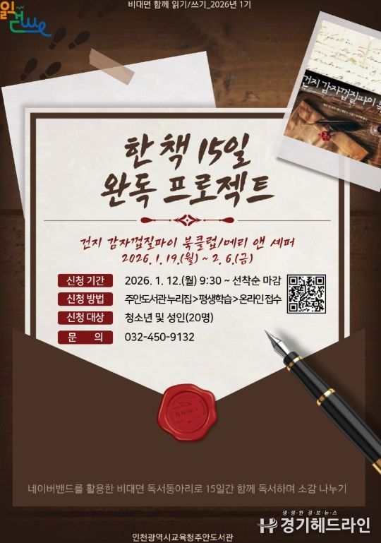 [경기헤드라인=문수철 기자] 인천광역시교육청주안도서관은 청소년과 성인을 대상으로 2026년 비대면 함께 읽기·쓰기'한 책 15일 완독 프로젝트'를 운영한다.