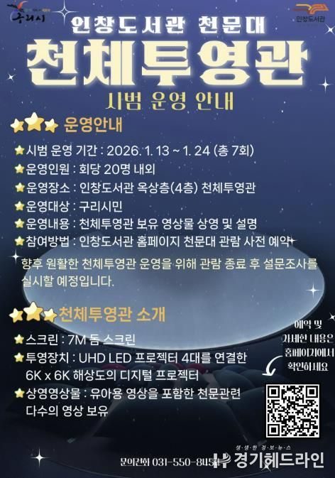 [경기헤드라인=문수철 기자] 구리시는 오는 1월 13일부터 24일까지 인창도서관 옥상에 설치된 천체투영관의 시범운영을 실시한다고 밝혔다.