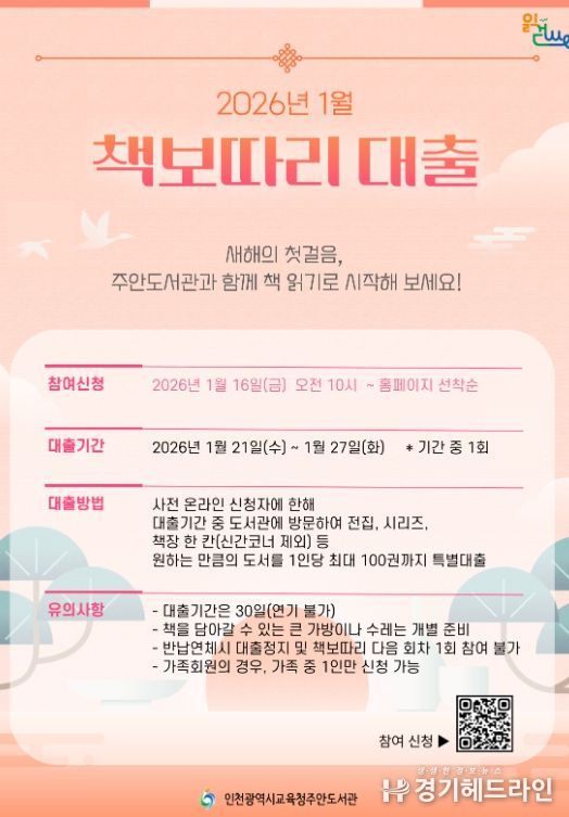 [경기헤드라인=문수철 기자] 인천광역시교육청주안도서관은 지역주민의 독서문화 정착과 대출 활성화를 위하여 2025년에 이어 올해도 '책 보따리 대출'을 실시한다고 14일 밝혔다.