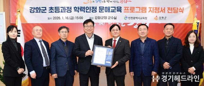 [경기헤드라인=문수철 기자] 인천광역시교육청은 강화군 내 저학력 성인의 기초학력 지원을 위해, 강화군청을 ‘초등 학력인정 문해교육 프로그램’ 운영기관으로 지정하고, 16일 지정서를 전달했다.