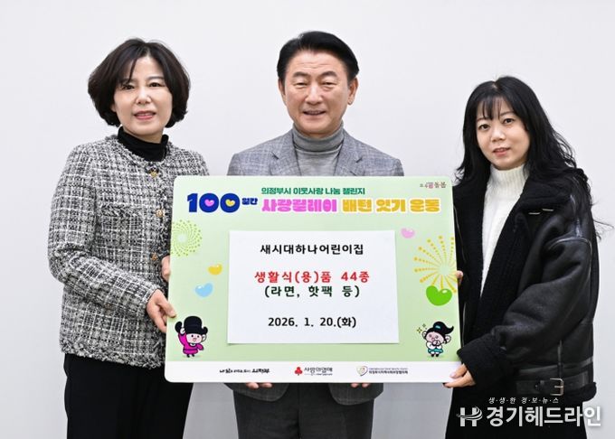 [경기헤드라인=문수철 기자] 의정부시는 1월 20일 새시대하나어린이집이 ‘100일간 사랑릴레이 배턴 잇기’에 동참해 관내 저소득층을 위한 생활식(용)품 44종(라면, 핫팩 등)을 기부했다고 밝혔다.