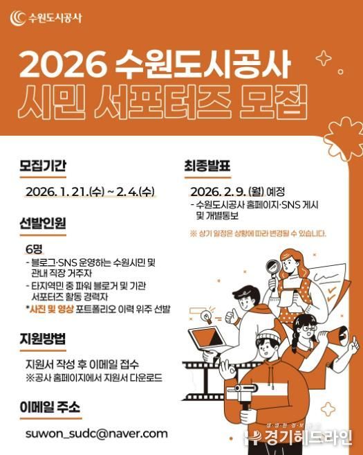 [경기헤드라인=문수철 기자] 수원도시공사가 21일부터 다음 달 4일까지 2026년도 제8기 시민 서포터즈를 모집한다.