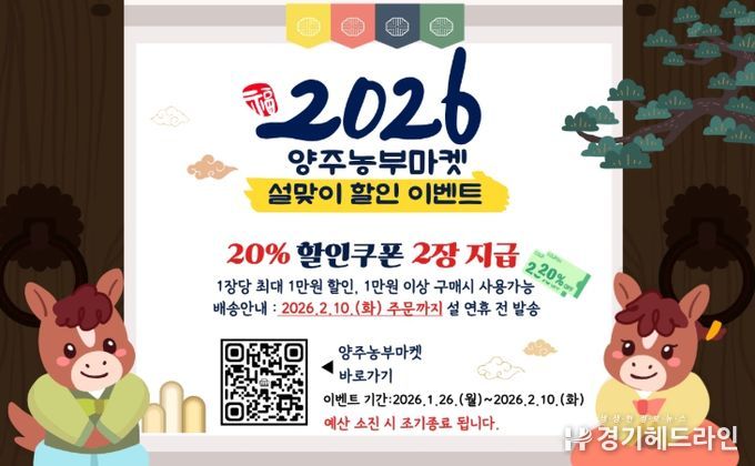 이번 이벤트는 1월 26일부터 2월 10일까지 진행하고, 기간 내 양주농부마켓 로그인 시 20% 할인쿠폰 2장이 자동 지급된다. 단, 예산 소진 시 조기 종료될 수 있다.