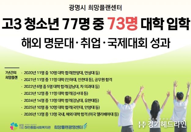 그 결과 2020년부터 2026년까지 희망플랜광명센터를 통해 지원받은 77명의 고등학교 3학년 청소년 가운데 73명이 대학에 합격했다. 취업 성공과 전문 분야 진출, 국제대회 입상 등 다양한 성과도 나타났다.