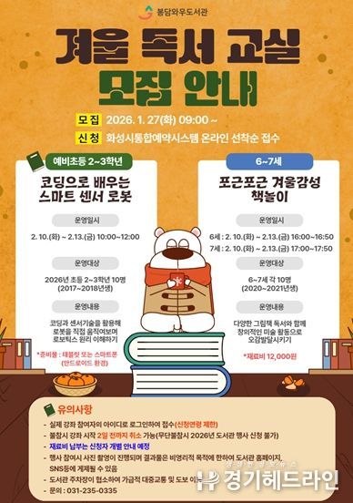 프로그램 참가 신청은 1월 27일부터 화성시통합예약시스템을 통해 선착순으로 접수하며, 자세한 운영 일정과 준비 사항은 화성시 도서관 홈페이지를 통해 확인할 수 있다.
