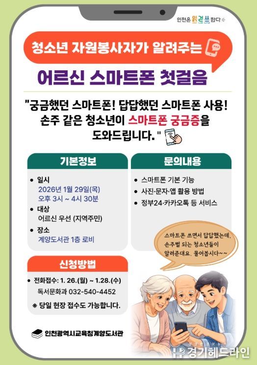 [경기헤드라인=문수철 기자] 인천광역시교육청계양도서관은 오는 29일 1층 로비에서 ‘어르신 스마트폰 첫걸음’행사를 운영한다.
