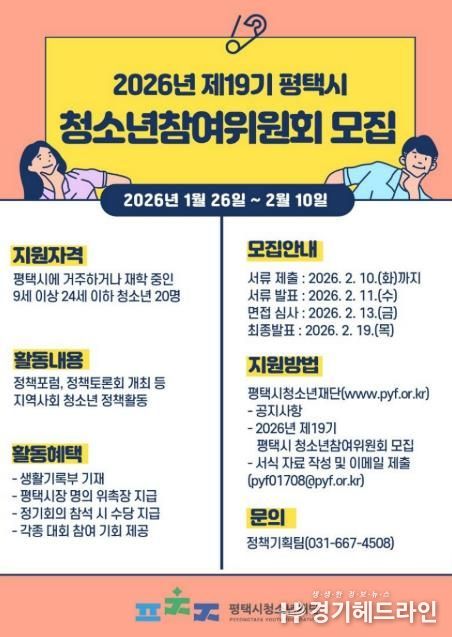 [경기헤드라인=문수철 기자] 평택시와 평택시청소년재단은 청소년 정책 참여 기회를 확대하고 자치 역량을 강화하기 위한 2026년 제19기 청소년참여위원회 위원 20명을 공개 모집한다고 밝혔다.