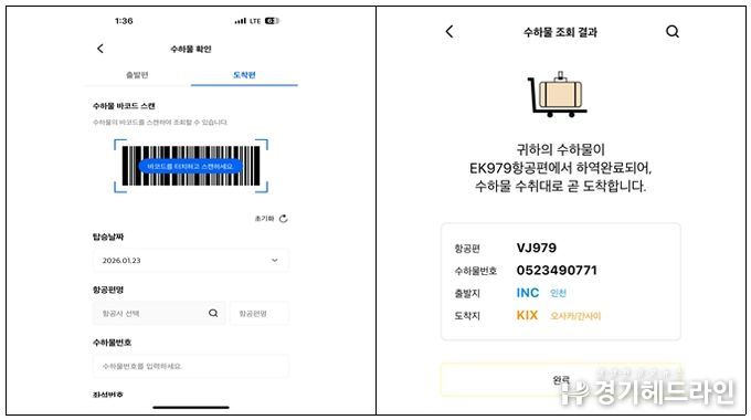 [경기헤드라인=문수철 기자] 인천국제공항공사는 인천공항본부세관과 함께 오는 30일부터 제1여객터미널 도착여객을 대상으로 인천공항 모바일 앱을 통한‘실시간 도착 수하물 정보 조회 서비스’를 제공한다고 29일 밝혔다.