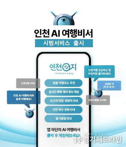 [경기헤드라인=문수철 기자] 인천광역시와 인천관광공사는 관광객이 보다 간편하게 인천 여행을 준비하고 즐길 수 있도록 스마트관광앱‘인천e지’에 생성형 인공지능(AI) 기반‘인천 AI여행비서’챗봇 서비스를 1월 29일부터 시범 운영한다고 밝혔다.