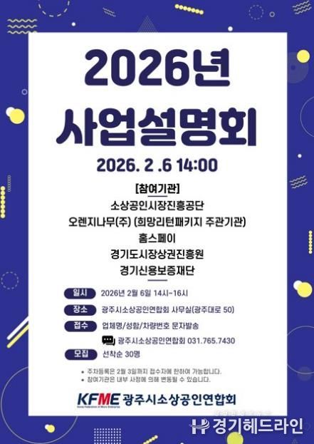 설명회는 오는 6일 오후 2시부터 4시까지 광주시소상공인연합회 사무실(광주대로 50)에서 열린다. 이날 행사에는 소상공인시장진흥공단, 홈스페이, 경기신용보증재단, 경기도시장상권진흥원이 참여해 기관별 2026년도 지원정책과 주요 사업을 설명할 예정이다. 참석자들은 정책 자금, 경영 개선 지원사업 등 분야별 정보를 한 자리에서 확인할 수 있다.