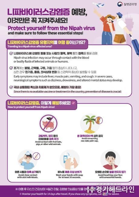 니파바이러스는 동물(과일박쥐ㆍ돼지 등)과 접촉하거나 오염된 식품(대추야자 수액 등)을 섭취하면 감염될 수 있으며, 환자의 체액과 밀접 접촉 시 사람 간 전파도 가능하다. 감염 초기에는 발열, 두통, 근육통이 나타나며 현기증, 졸음, 의식 저하 등 신경계 증상 및 중증으로 악화해 사망에 이를 수 있어 주의가 필요하다.