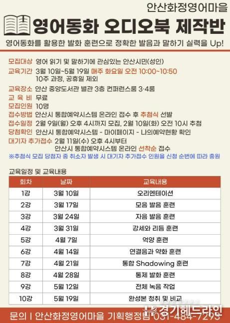 [경기헤드라인=문수철 기자] 안산시가 설립하고 안산대학교가 운영하는 안산화정영어마을이 성인 영어 학습자를 위한 ‘영어동화 오디오북 제작반’을 3월부터 5월까지 10주 과정으로 안산시 중앙도서관에서 운영한다고 4일 밝혔다.
