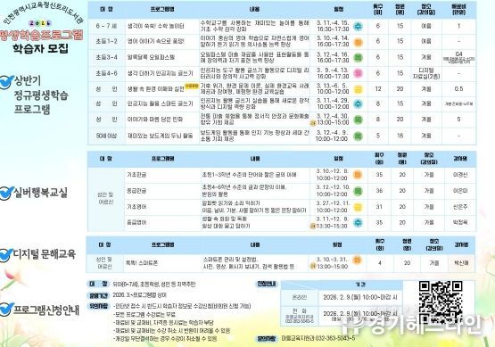 [경기헤드라인=문수철 기자] 인천광역시교육청신트리도서관은 지역 주민의 생애주기별 학습 기회 제공을 위해 2026년 상반기 평생학습프로그램 학습자를 모집한다.
