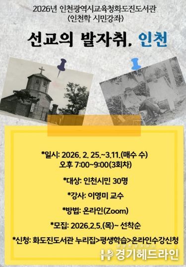 [경기헤드라인=문수철 기자] 인천광역시교육청화도진도서관은 ‘선교의 발자취, 인천’이라는 주제로 2026년 인천학 시민강좌를 운영한다.