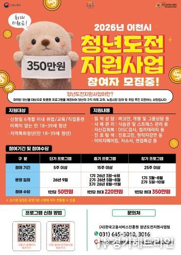 [경기헤드라인=정현수 기자] 이천시는 지역 내 미취업 청년들의 진로 탐색과 취업역량 강화를 위해 운영하는 ‘청년도전지원사업’의 참여자를 2월 4일부터 모집한다고 밝혔다.