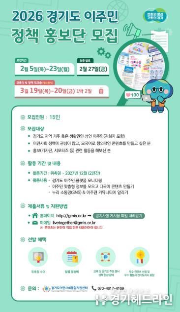 [경기헤드라인=문수철 기자] 경기도이민사회통합지원센터에서 오는 23일까지 ‘2026 경기도 이주민 정책 홍보단’ 15명을 모집한다.