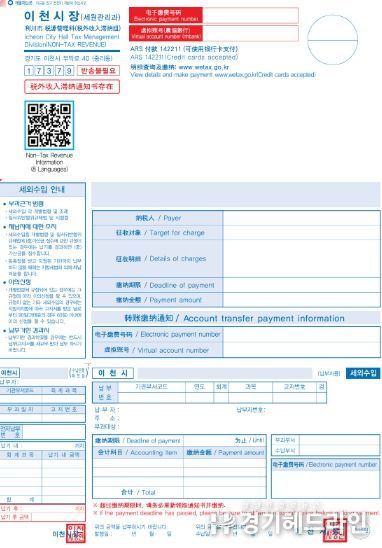 [경기헤드라인=정현수 기자] 이천시는 맞춤형 세무 행정 실현과 다문화 포용 정책 추진사업의 일환으로 경기도 최초 외국인 대상 다국어(영어·중국어·베트남어) 세외수입 체납고지서를 발송하고, 언어장벽으로 인한 세무 행정 사각지대 해소에 나선다고 밝혔다.