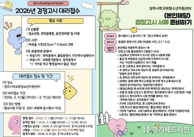 [경기헤드라인=김윤종 기자] 양주시학교밖청소년지원센터에서는 학교 밖 청소년들을 위해 2026년 제1회 초중고 졸업 학력 검정고시 응시 원서 접수 대행을 지원한다.