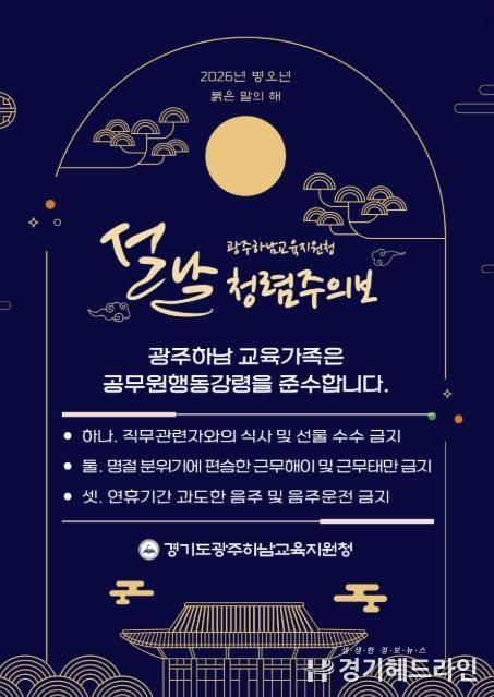 [경기헤드라인=정현수 기자] 경기도광주하남교육지원청은 2월 9일, 2026년 병오년 설명절을 맞아 관내 교직원들이 청렴한 마음가짐으로 새해를 시작할 수 있도록‘교육장 청렴서한문’과‘청렴주의보’를 각급 학교에 전달했다.