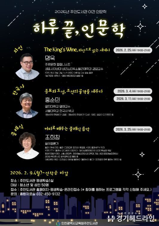 [경기헤드라인=문수철 기자] 인천광역시교육청주안도서관은 2월부터 3월까지 시민들이 다양한 인문학 주제를 접할 수 있는 야간 인문학 프로그램 ‘하루 끝, 인문학’을 운영한다.