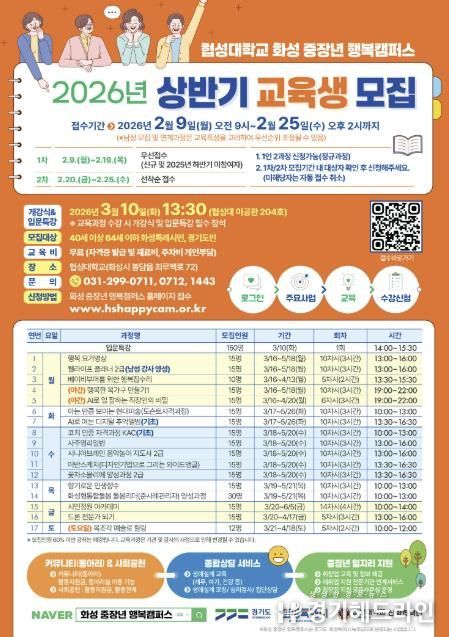 교육은 협성대학교(화성시 봉담읍 최루백로 72)에서 진행되며, 신청은 화성 중장년 행복캠퍼스 홈페이지를 통해 가능하다.