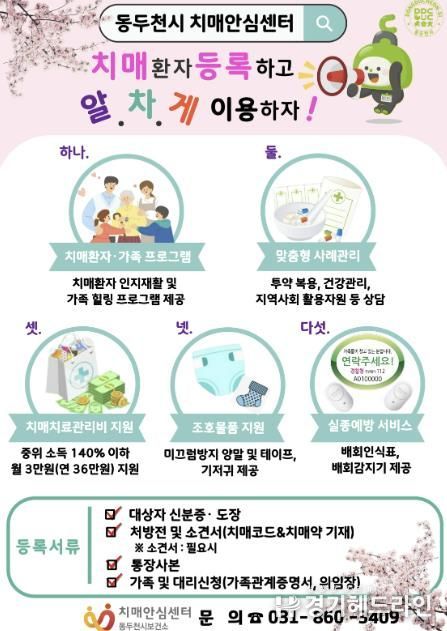 보건소 치매안심센터 관계자는 “치매로부터 걱정 없는 행복한 동두천시를 만들기 위한 가장 중요한 첫걸음은 치매환자 등록”이라며 “환자와 가족, 보호자가 안심하고 생활할 수 있도록 촘촘한 지원 체계를 이어가겠다”라고 말했다.