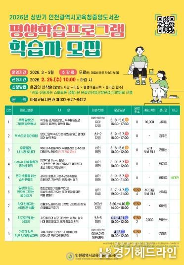 [경기헤드라인=문수철 기자] 인천광역시교육청중앙도서관은 주민의 평생교육 기회를 확대하기 위하여 오는 25일부터 ‘상반기 평생학습프로그램’ 학습자를 모집한다