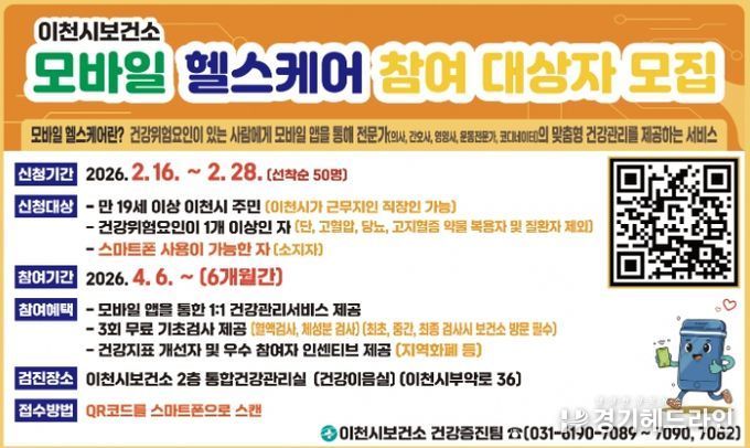[경기헤드라인=정현수 기자] 이천시는 스마트폰을 활용한 맞춤형 건강관리 서비스를 제공하는 모바일 헬스케어 사업 대상자를 2월 16일부터 2월 28일까지 선착순으로 모집한다.